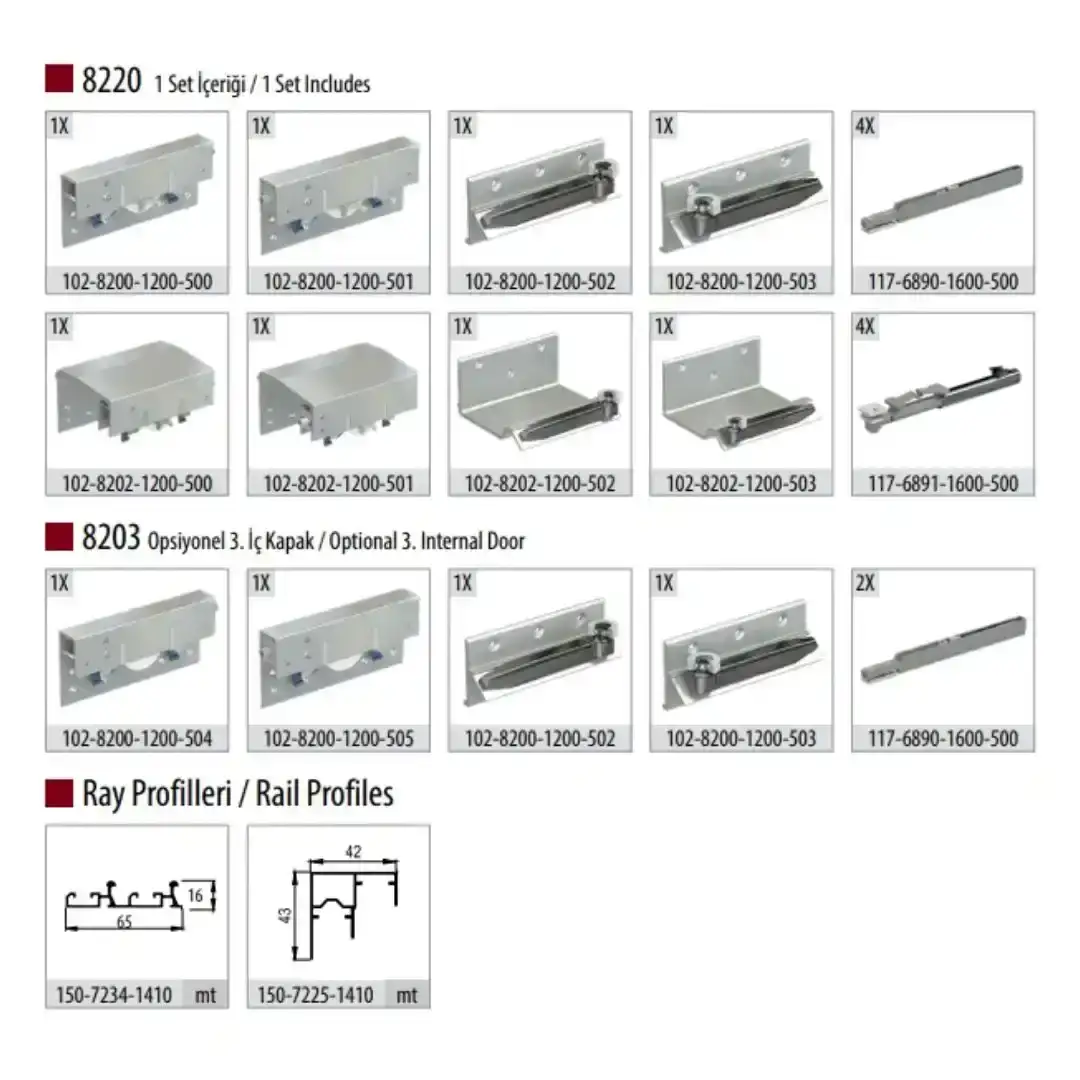Alt ve üst ray içerisinde 2 kapak için 8 adet sürgü yavaşlatıcısı bulunur.