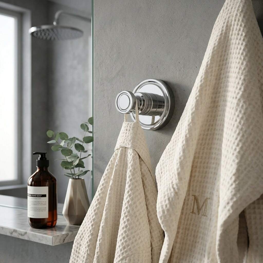 Defne Aster serisinin zarafetini yansıtan bu tekli bornoz askısı, modern banyo tasarımlarınıza mükemmel bir uyum sağlar. Yüksek kaliteli materyalleri ve göz alıcı parlak krom yüzeyi ile hem dayanıklı hem de estetik bir kullanım sunar.