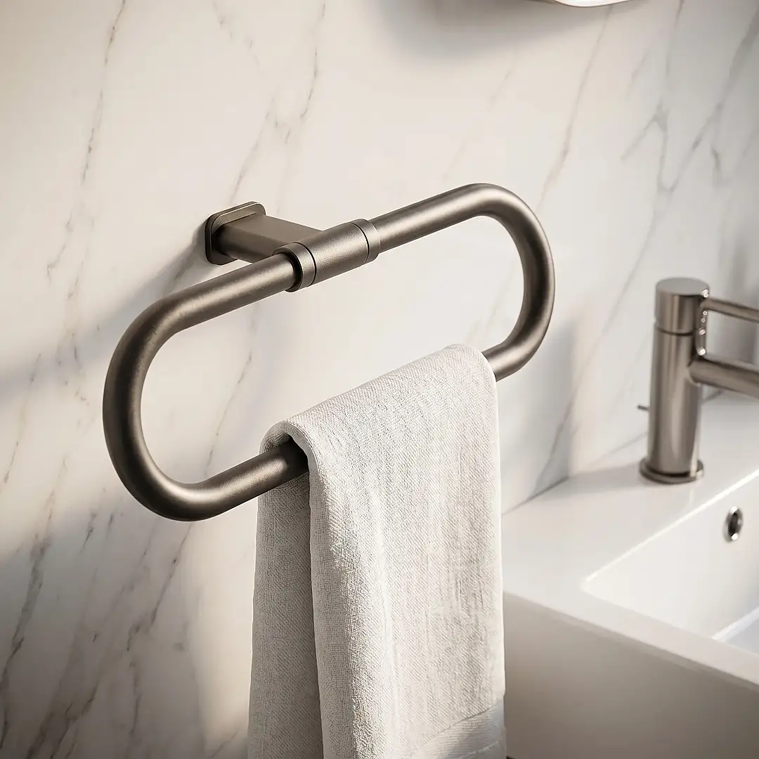 Banyo aksesuarlarında sıradanlıktan uzaklaşmak isteyenler için tasarlanan Defne Lotus Yuvarlak Havluluk, mat antrasit kaplamasıyla banyonuza sofistike bir hava katar. Oval hatları ve kompakt yapısı sayesinde dar alanlarda bile şık bir kullanım sunar.