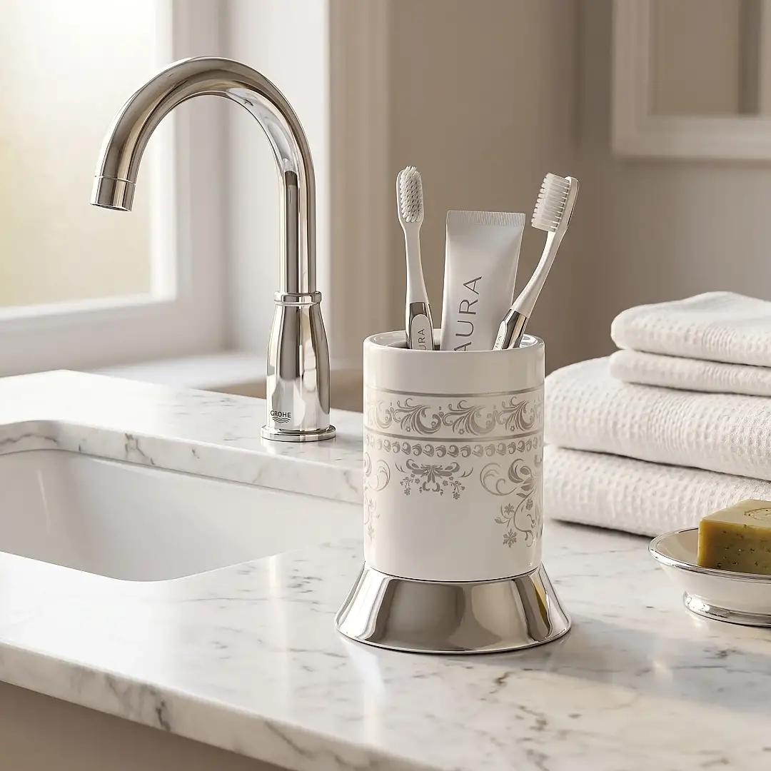 Banyo tezgahınızda düzeni ve estetiği bir araya getiren Defne Reyhan Set Üstü Diş Fırçalık, kromun zamansız şıklığını modern bir formla sunuyor. 9530 model kodu ile üretilen bu parça, banyo aksesuarlarınızda bütünlük sağlamak ve hijyenik bir kullanım alanı yaratmak için idealdir.