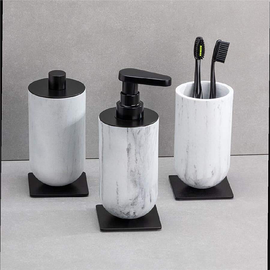 Banyonuzda düzeni sağlarken stilinizden ödün vermeyin. Mermer desenli siyah tasarımı ile modern banyo konseptlerine tam uyum sağlayan bu diş fırçalık, banyo tezgahınızın havasını anında değiştirir. 143x75x75 mm ideal ölçüleri sayesinde geniş iç hacim sunarken, kompakt yapısıyla fazla yer kaplamaz.