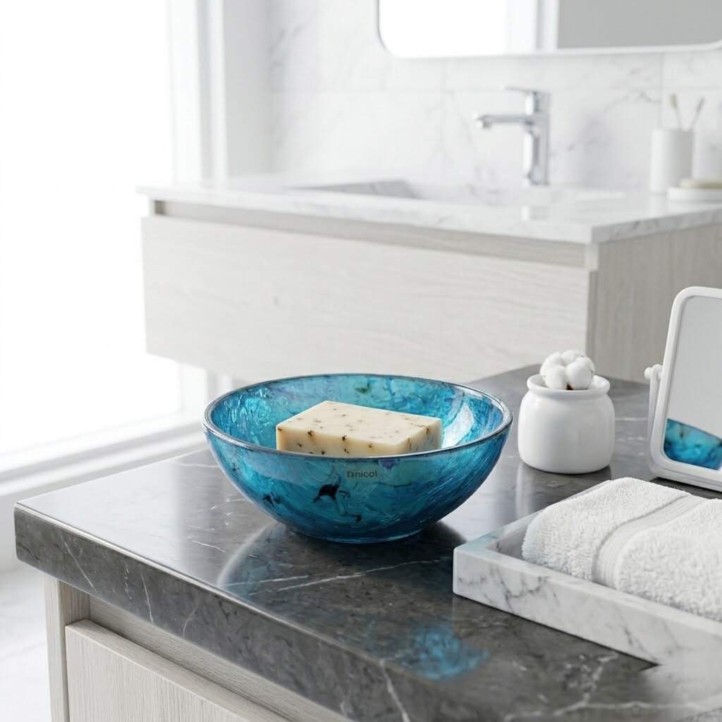Canlı Turkuaz Rengi: Kristal berraklığındaki turkuaz tonu, ışıkla etkileşime girerek banyonuzda ferah ve huzurlu bir atmosfer yaratır.