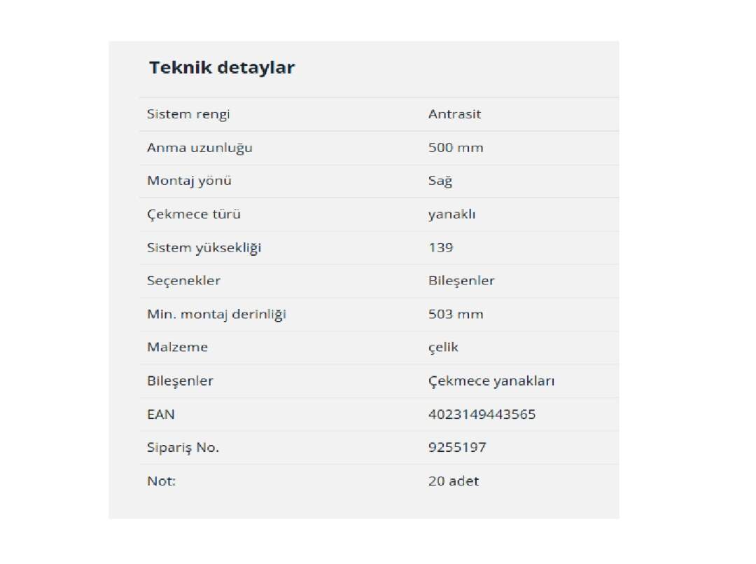 - Çekmece ön konnektörü ayrı olarak sipariş edilmelidir