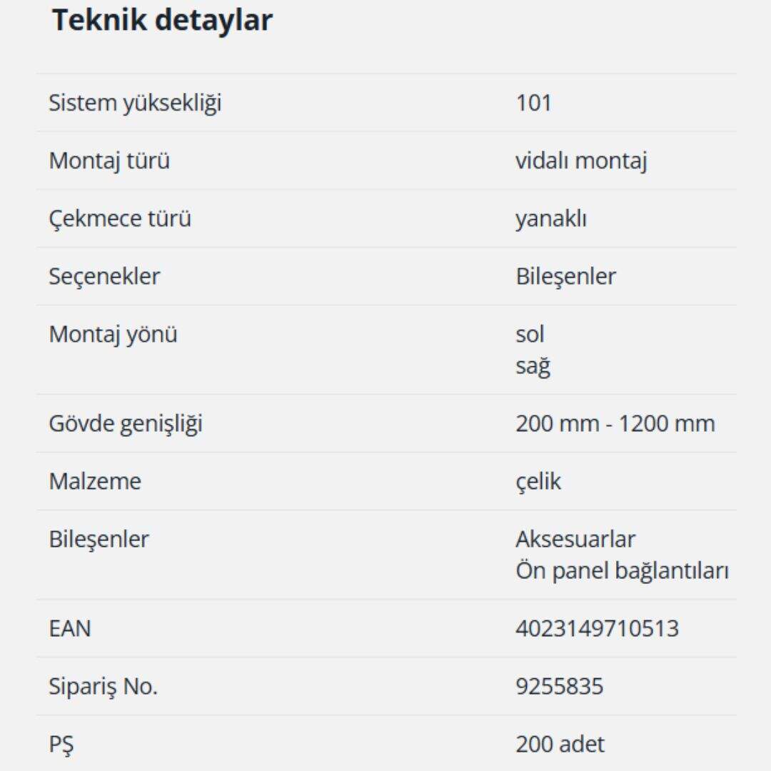 Hettich AvanTech You Kasa Ön Panel Bağlantısı 101 mm Vidalı Montaj (9255835)