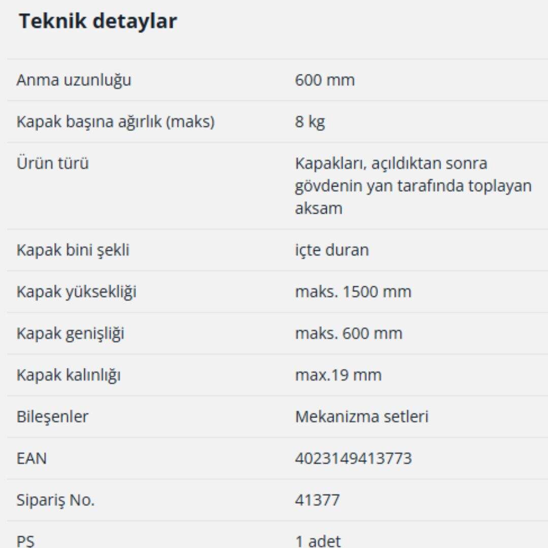*Bilyalı rulmanlı kızak, kapı genişliğine göre seçilmelidir. Önerilen menteşelerin teknik özellikleri, maksimum kapı genişliğinin 600 mm'yi aşmaması gerektiğini belirtmektedir.