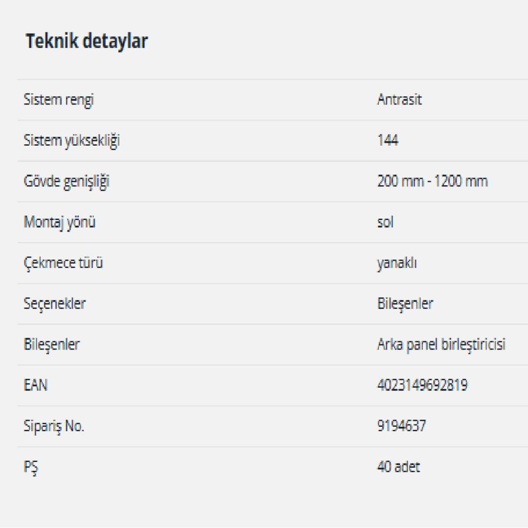 Hettich InnoTech Atira Arka Panel Birleştirici 144 mm Antrasit Sol (9194637)