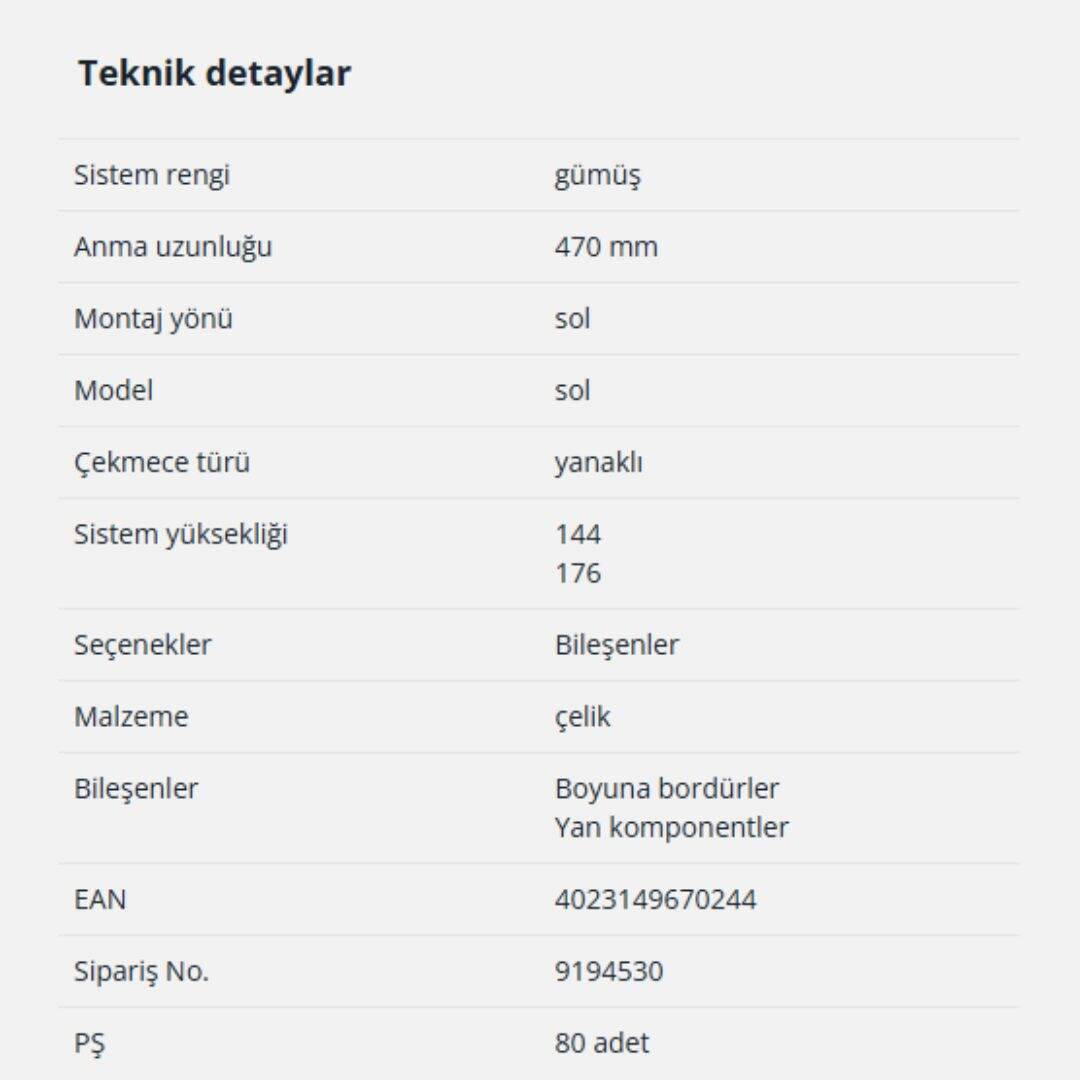 Hettich InnoTech Atira Bordür Çubuğu 470mm Gri Sol (9194530)