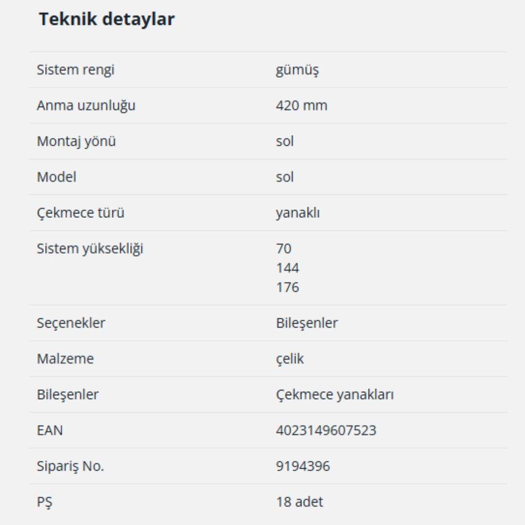Hettich InnoTech Atira Çekmece Yanağı 420mm Sol Gri (9194396)