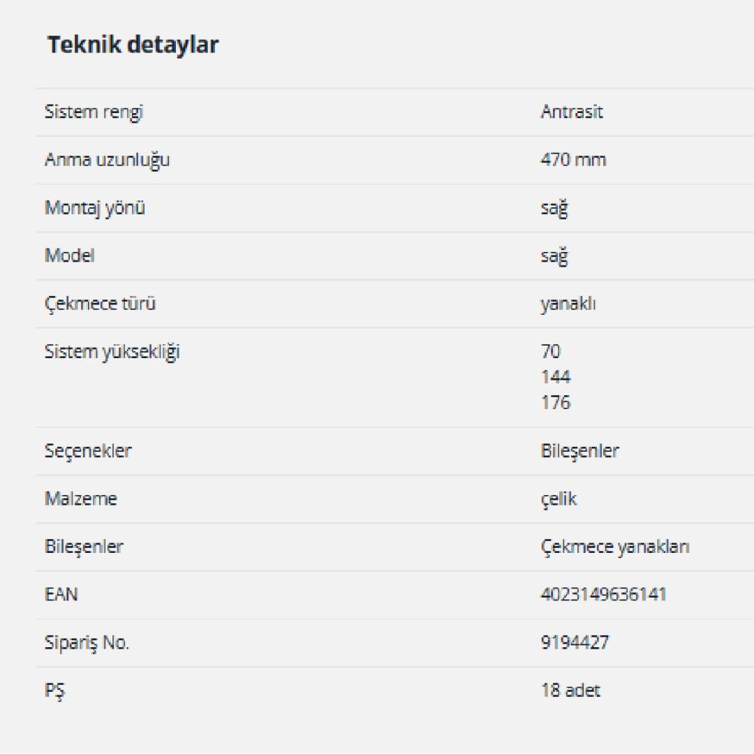 Hettich InnoTech Atira Çekmece Yanağı 470 mm Antrasit Sağ (9194427)