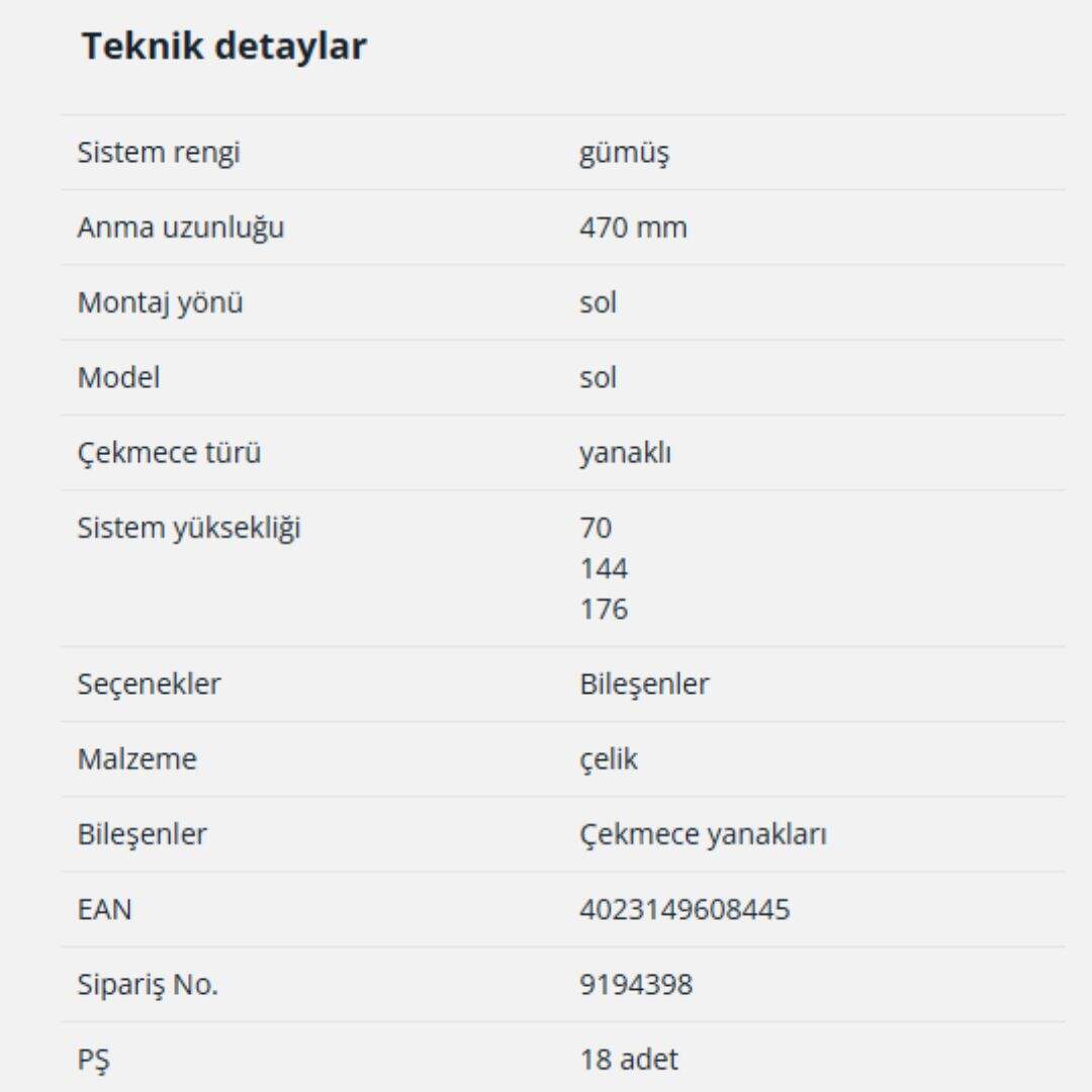 Hettich InnoTech Atira Çekmece Yanağı 470 mm Gri Sol (9194398)