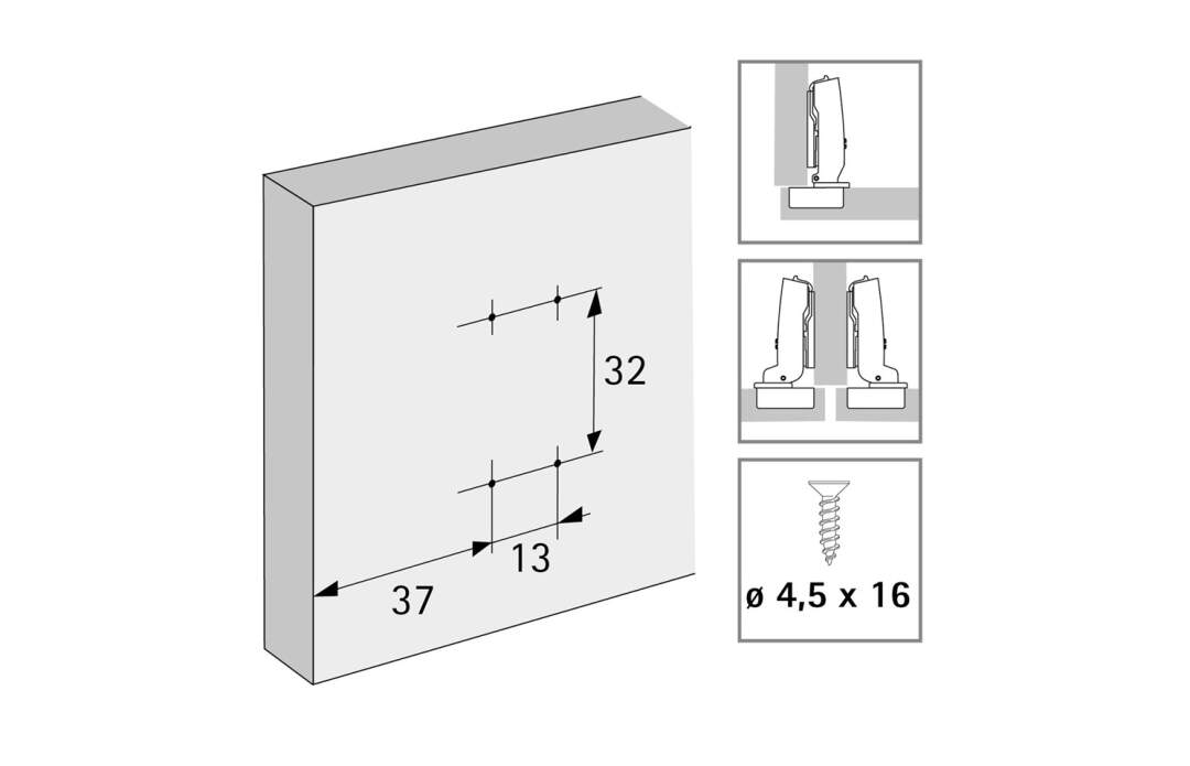 - için Sıralı delik 37 / 50 x 32 mm (50 x 32 mm delik sırası üzerinde ilave sabitleme konumları)