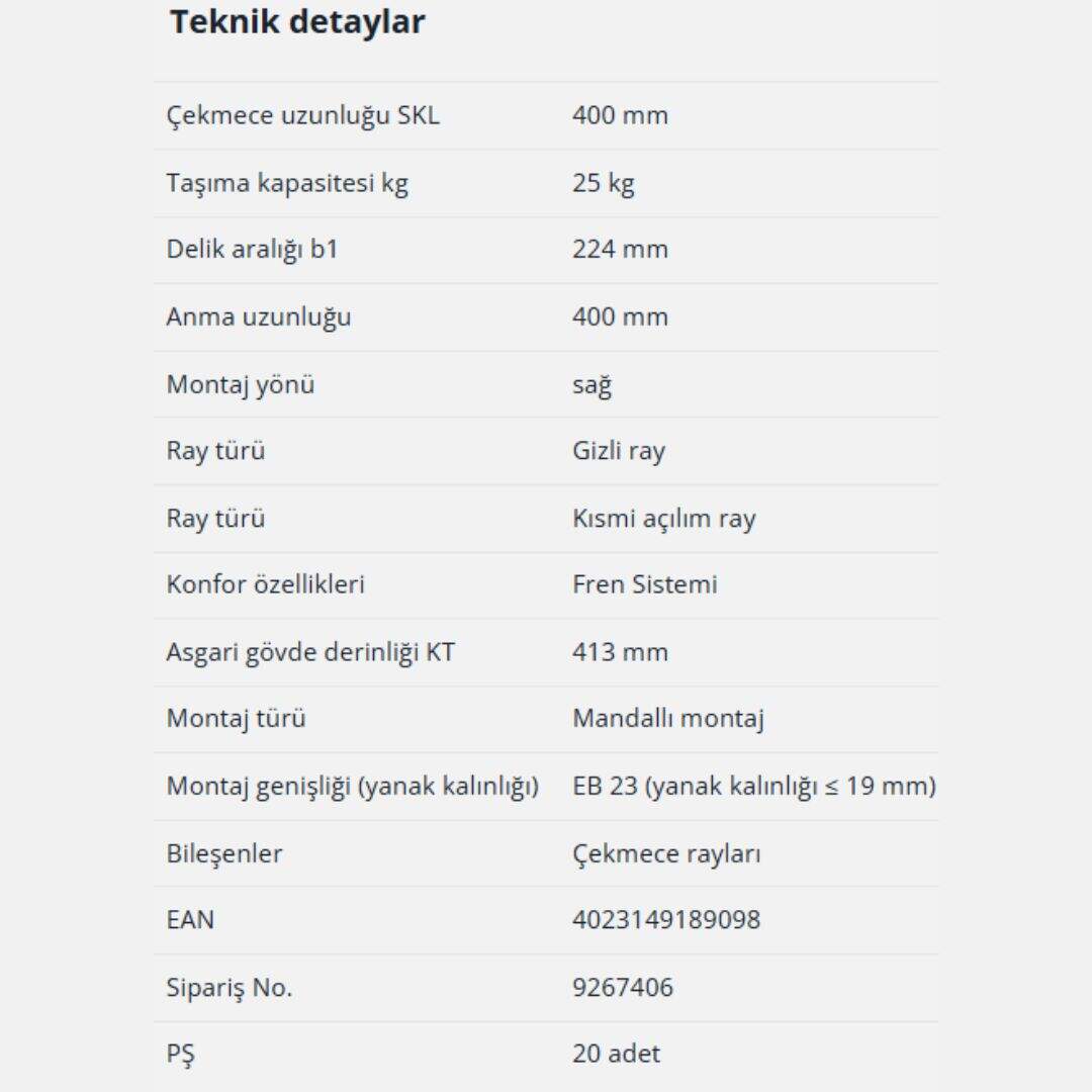 Hettich Quadro Kısmi Açılım Frenli Ray 40 cm Sağ (9267406)
