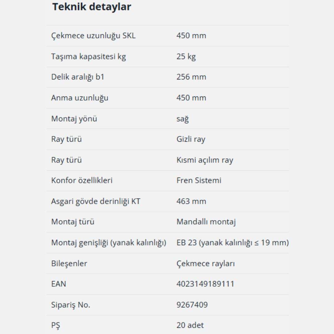 Hettich Quadro Kısmi Açılım Frenli Ray 45 cm Sağ (9267409)