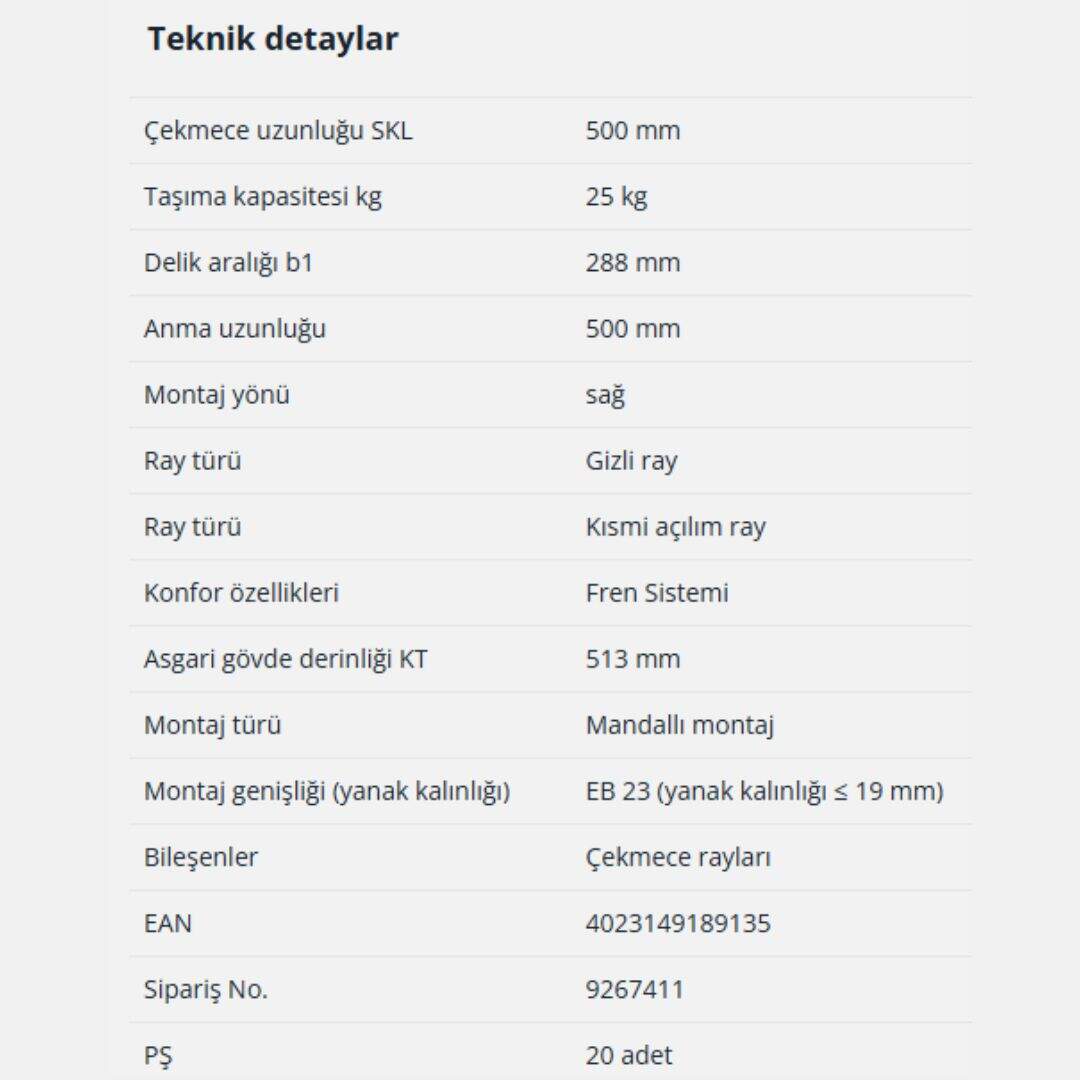 Hettich Quadro Kısmi Açılım Frenli Ray 50 cm Sağ