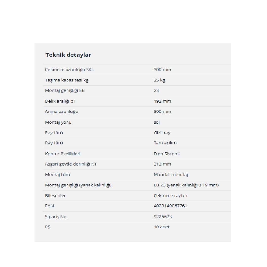 Hettich Quadro Tam Açılım Frenli Ray Sol 30 cm (9225673)