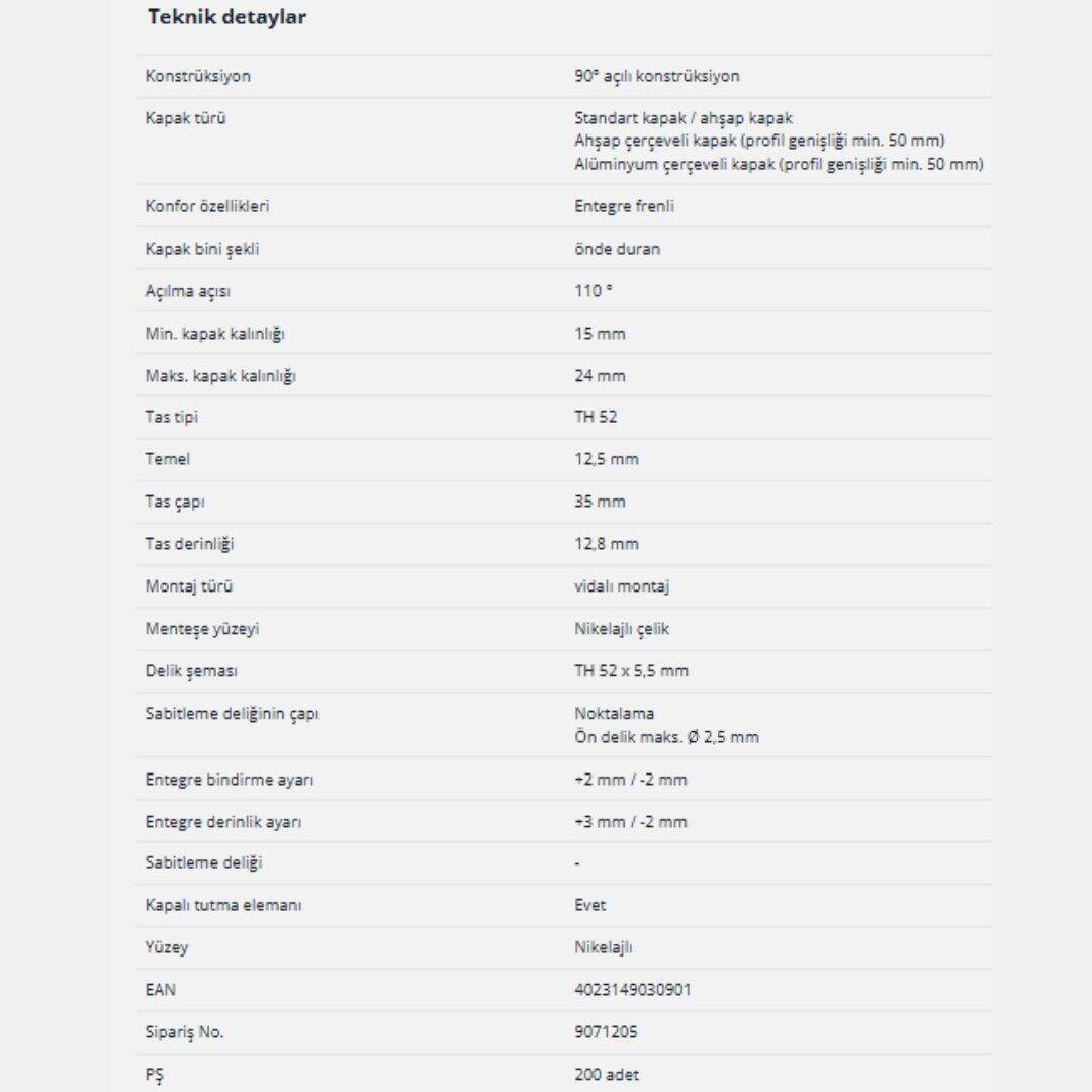 Hettich Sensys Frenli Düz Menteşe 110 Derece, 110° Frenli Menteşe (9071205)