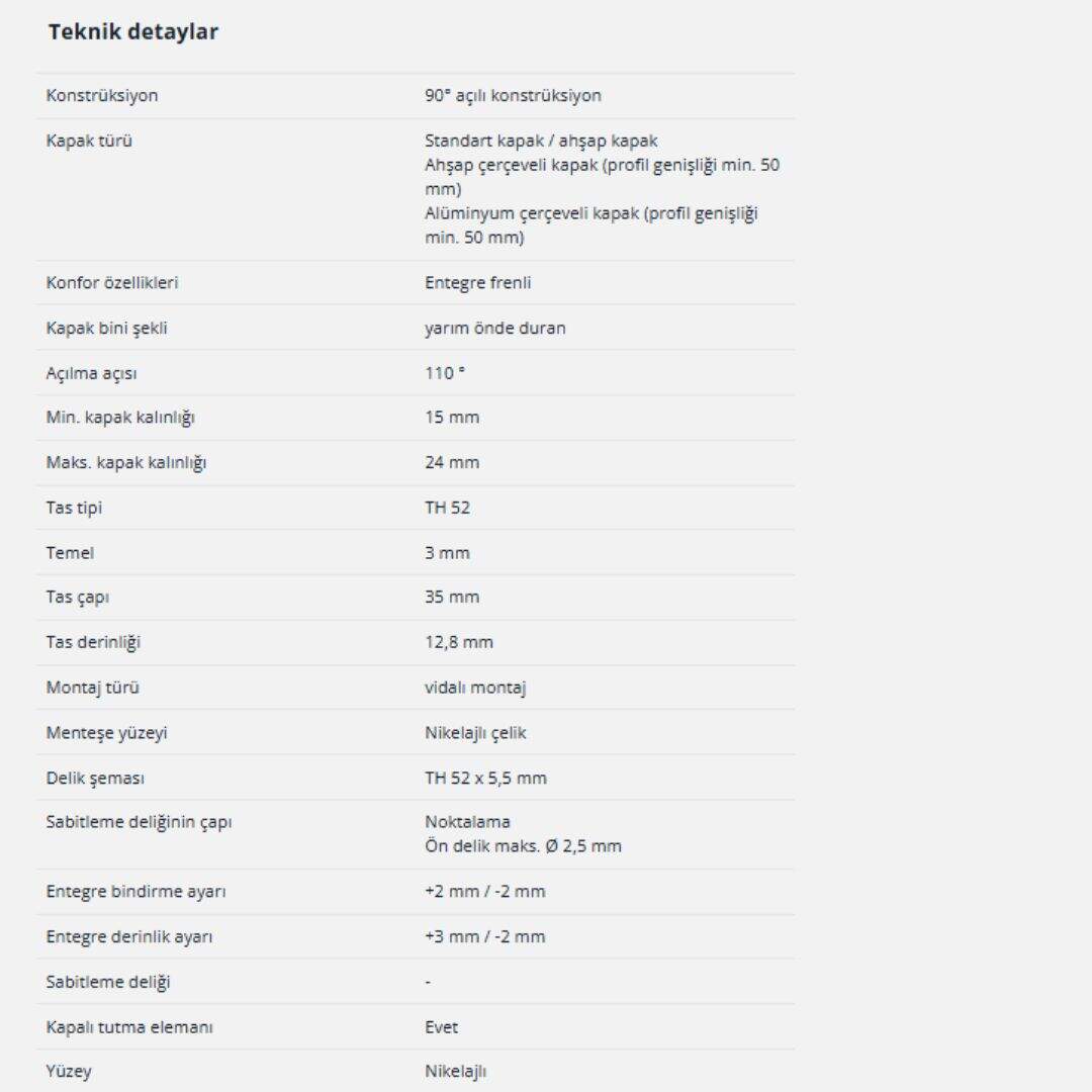 Hettich Sensys Yarım Deve Menteşe 110 Derece Frenli (9071206)