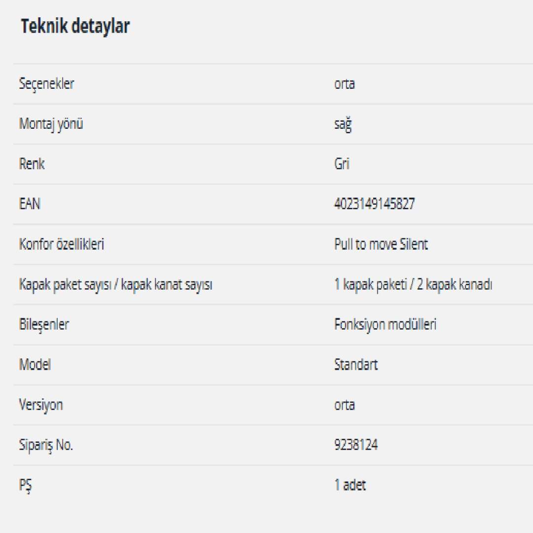 Hettich Wingline L Komple Set Gri Sağ (9238124)