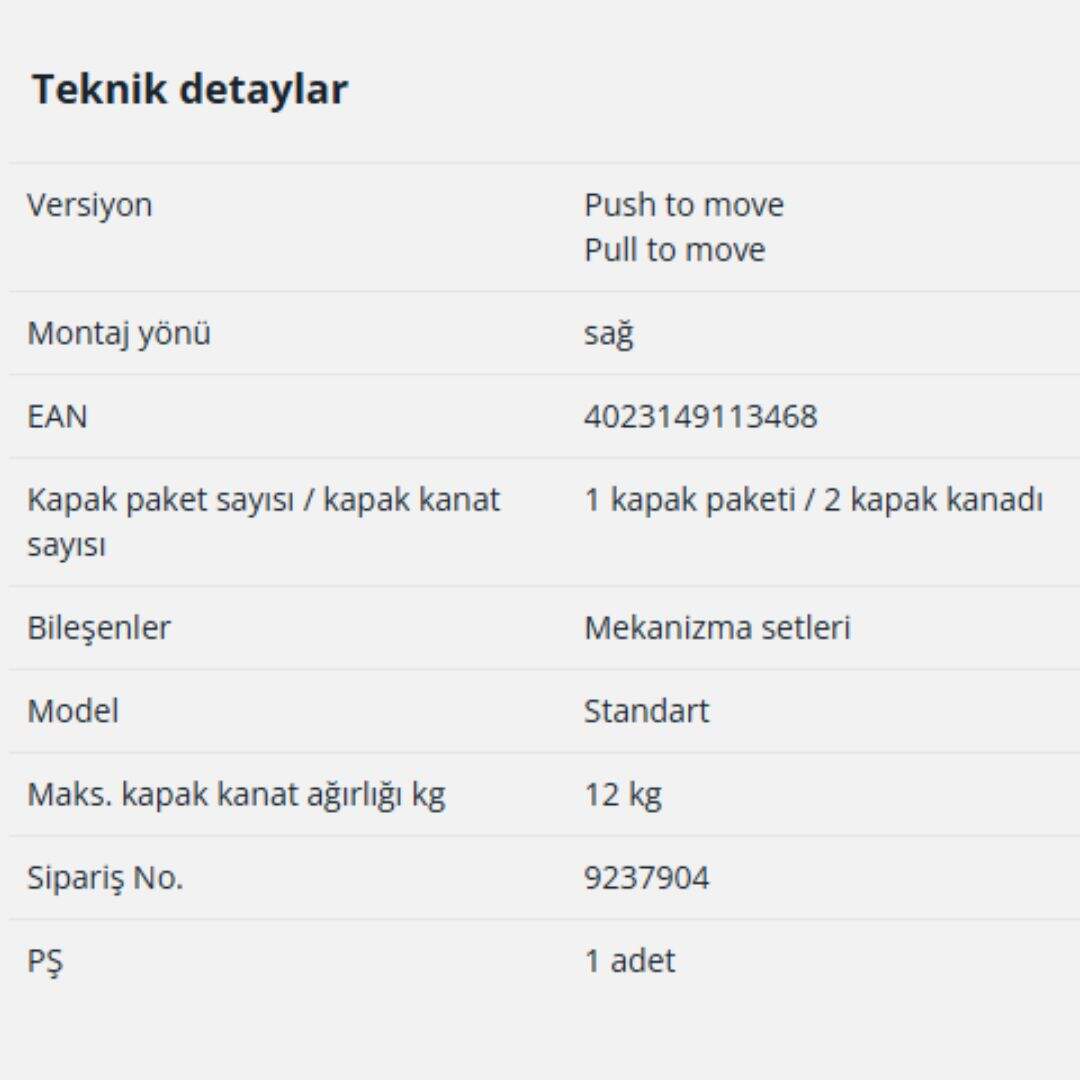 - Mekanizma setinde, 1 adet 2 kanatlı katlanır kapak için gereken tüm parçalar bulunmaktadır