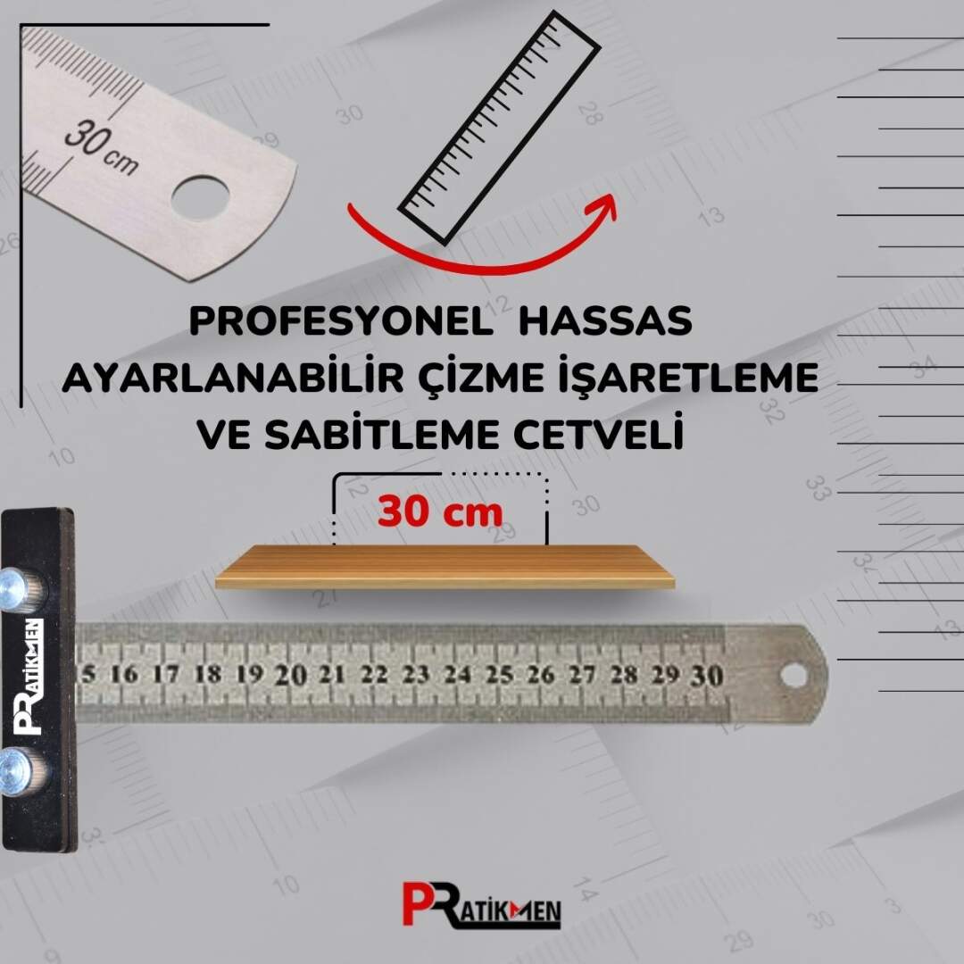 Pratikmen Profesyonel Hassas Ayarlanabilir Çizme, İşaretleme ve Sabitleme Cetveli 30 cm (SL0525)