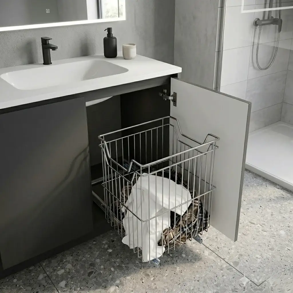 Banyonuzda profesyonel düzen! Pyramith C-7048C, 45 cm modül genişliğindeki dolaplar için özel olarak tasarlanmış, alttan raylı mekanizmasıyla çamaşır yönetimini zahmetsiz hale getiren bir sepet sistemidir. Şık tasarımıyla kirli çamaşırlarınızı dolap içinde gizlerken, banyonuza modern bir dokunuş katar.