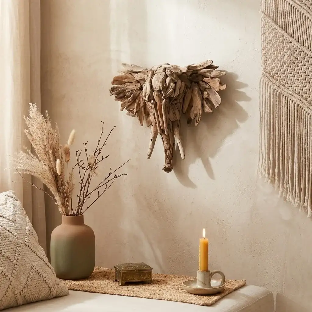 Bu şık fil figürünü, makrome duvar süsleri, hasır sepetler veya büyük yeşil yapraklı bitkilerle kombinleyerek tam bir bohem stil oluşturabilirsiniz. Modern bir görünüm için ise sade ve açık renkli bir duvarda tek başına yıldız parça olarak kullanmanızı öneririz.