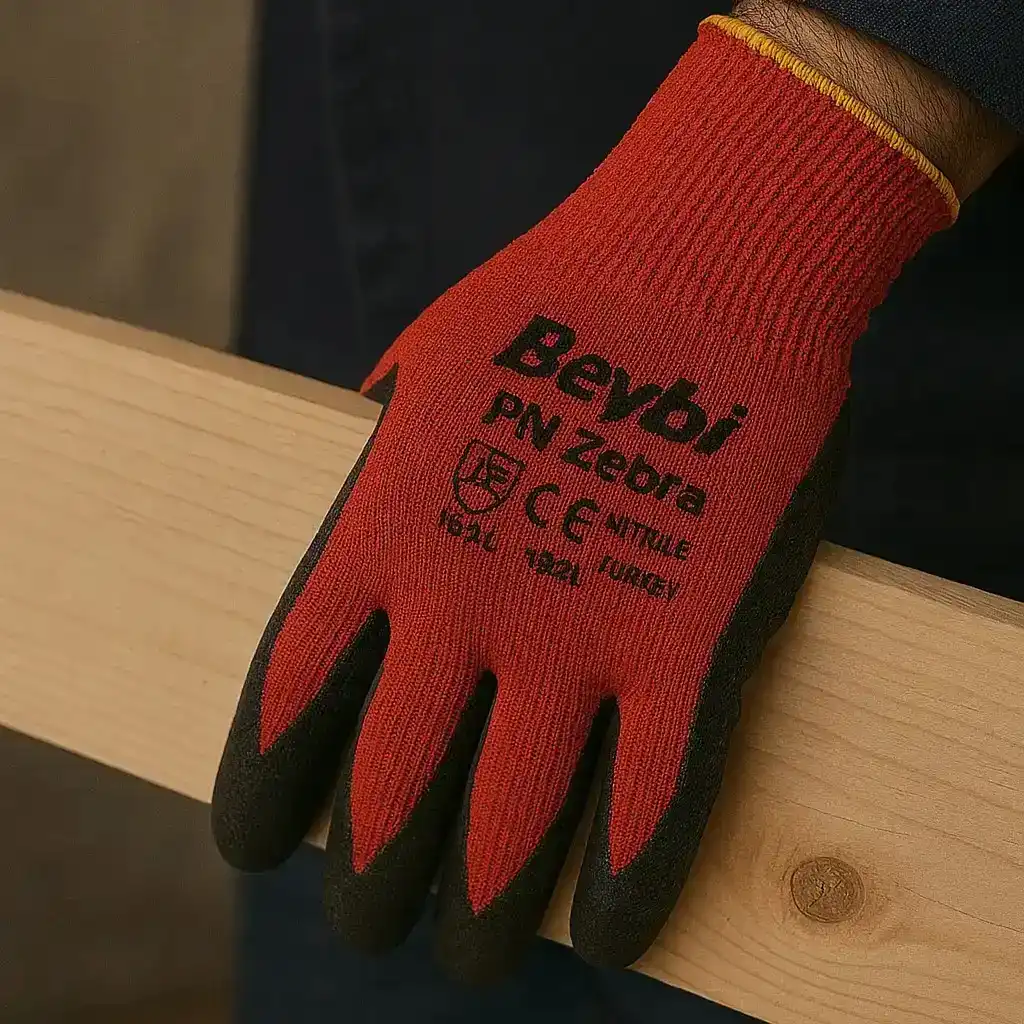 Tanım; Polyester iplikten örülmüş ve nitril ile yarı kaplanmış, iş eldiveni.