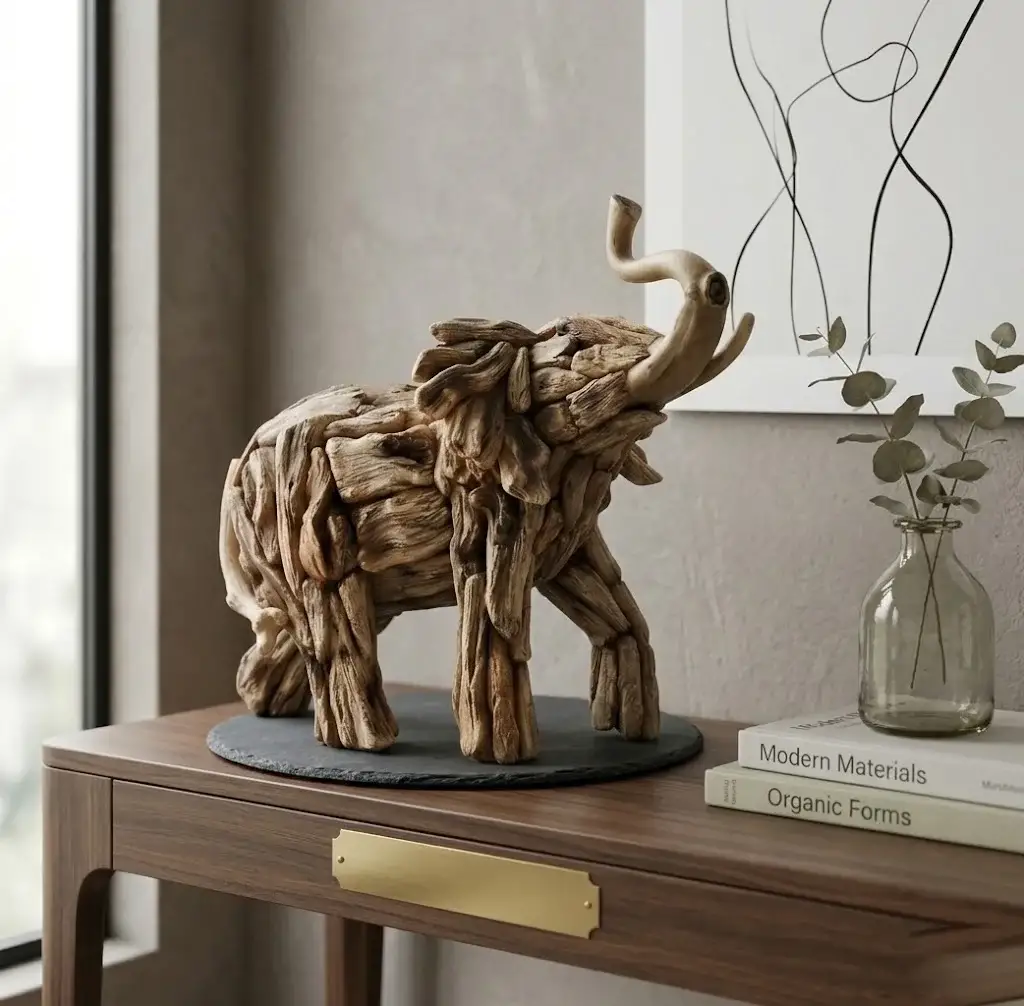 Yaşam alanlarınıza bilgeliğin ve gücün sembolü olan fil figürünü, doğanın ham dokusuyla getirin. Sese Polyester Fil Figür, denizden kıyıya vuran dal parçalarının (driftwood) doğal ve amorf formlarından ilham alınarak tasarlanmış sanatsal bir dekorasyon ürünüdür.