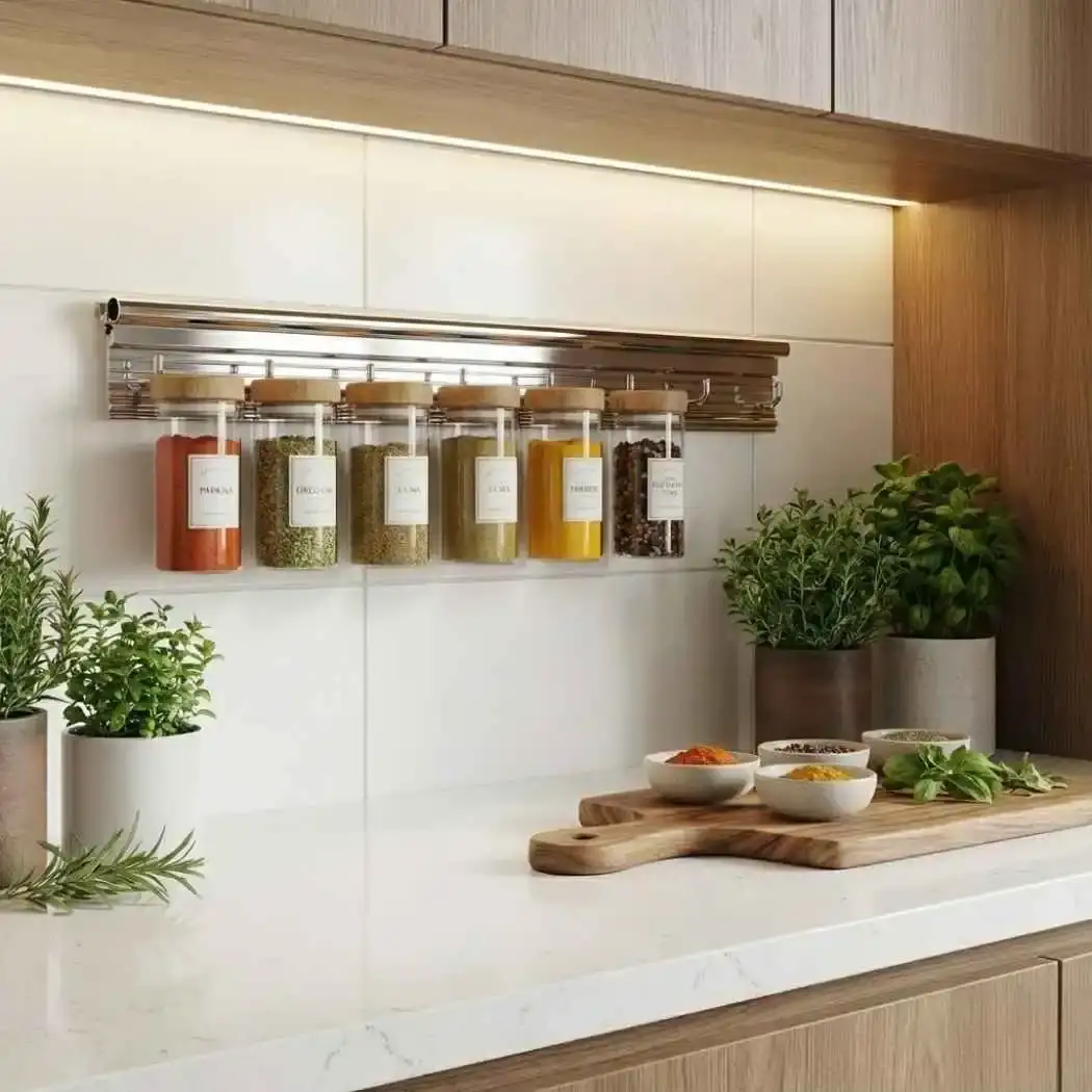 Mutfakta: Baharatlıklarınızı, kepçelerinizi ve kurulama bezlerinizi asarak tezgâh üzerindeki kalabalığı azaltın.