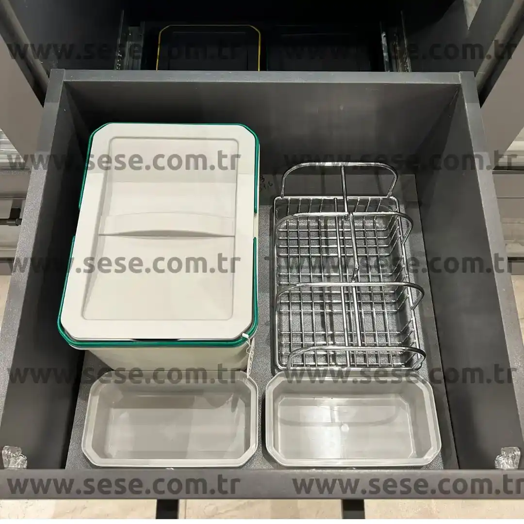 Starax’ın çekmece içine entegre edilebilen çöp kovaları, mutfak dolaplarıyla tam uyumlu olacak şekilde tasarlanmıştır. Bu sayede hem alan tasarrufu sağlar hem de çöp kovasının görünürlüğünü ortadan kaldırarak daha temiz ve düzenli bir görünüm elde edilmesine yardımcı olur.