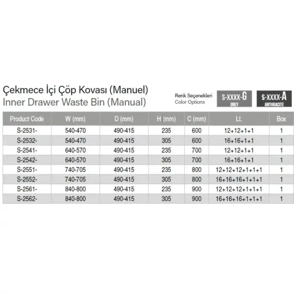 Gelince Haber VerStarax Çekmece İçi Manuel Çöp Kovası 32+2 Litre Gri 70cm (S-2542-G)