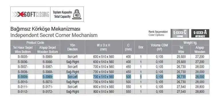 Starax Döner Tablalı Kör Köşe Mekanizması Sol Fasulye Frenli Krom Modül 45cm (S-3013-C)